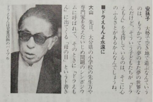 以下に引用するのは『ドラえもん』(小学館)などで知られる藤子・F・不二雄(藤本弘)先生が1996年に逝去された際に月刊誌「婦人公論」にて行われた鼎談で藤子不二雄A、大山のぶ代、石ノ森章太郎の三氏が参加しておられる(字数の関係上全文ではない)。